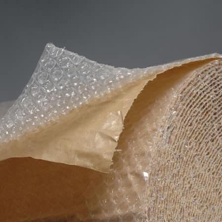 نایلون حبابدار لمینت با کاغذ: روکش کاغذی لمینت شده روی این نایلون به منظور مانع شدن از نفوذ گرد و غبار، نور و حرارت مخصوصا در تابستان می شود.